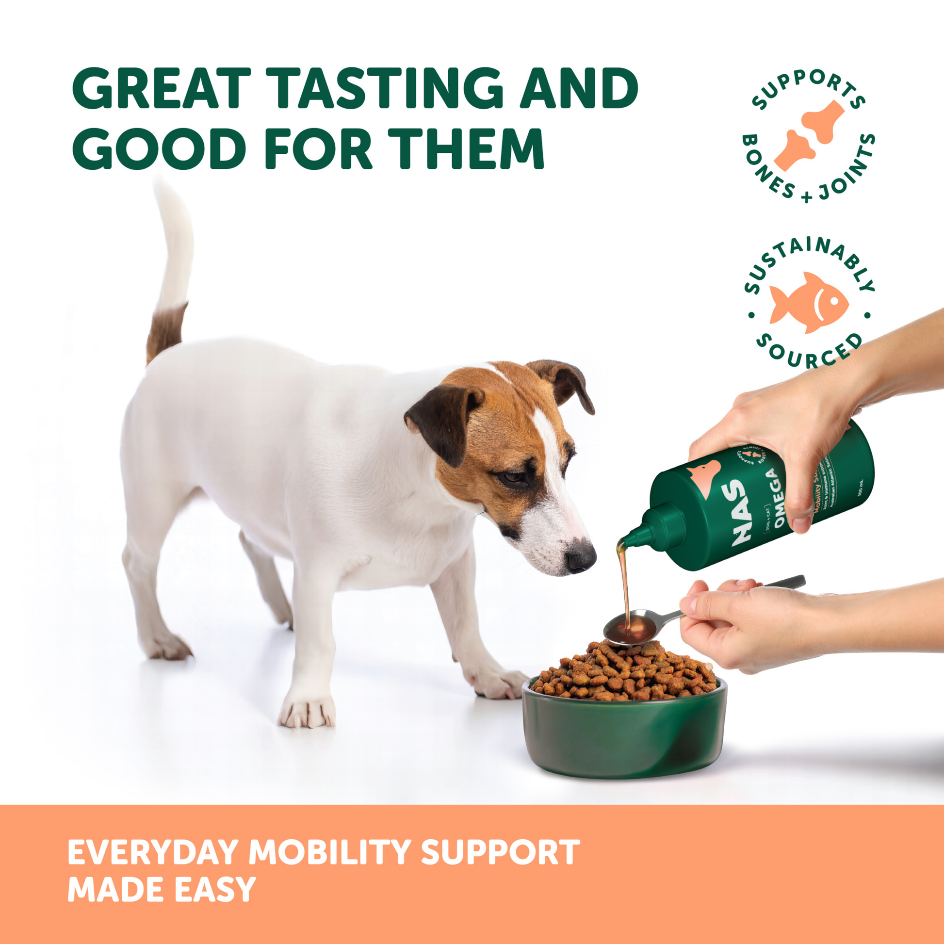 100% Tasmanian salmon oil rich in EPA/DHA and vitamin E for skin, coat, and joint health.